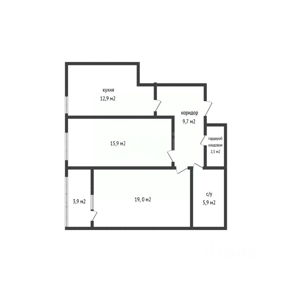 Кухня большая— 12,9 м², две изолированные комнаты — 19,0 м² и 15,9 м². Санузел совмещён- огромный 5,9 м2, по желанию можно разделить и из гардеробной 2,5 м2 сделать второй санузел, коридор 9,7 м2- просторный и правильной формы.