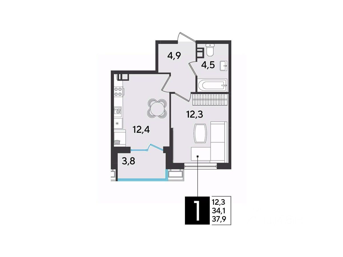 Срок сдачи: 2 кв. 2026, общей площадью 37.9 кв.м., на 9 этаже.