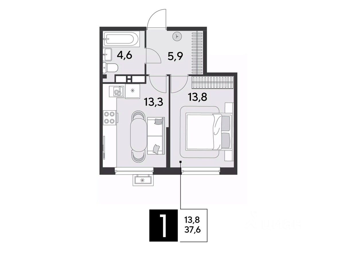 Срок сдачи: 2 кв. 2026, общей площадью 37.6 кв.м., на 13 этаже.