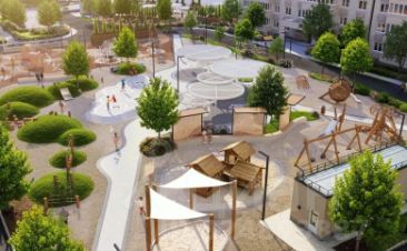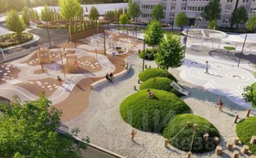 Двор комплекса закрыт от автомобилей и случайных прохожих. Для автовладельцев предусмотрен двухуровневый подземный паркинг на 650 мест. По всему периметру двора размещены видеокамеры. Внутренний двор благоустроен: предусмотрены пешеходные дорожки, скамейки и деревянные мини-беседки с розетками. Также спроектированы детские игровые площадки, уличные тренажеры и спортивная площадка для командных игр.
