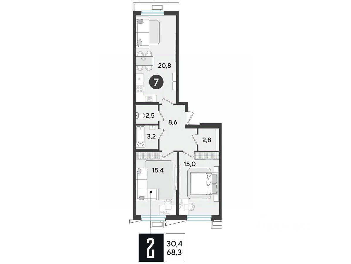 Срок сдачи: 1 кв. 2026, общей площадью 67 кв.м., на 2 этаже.