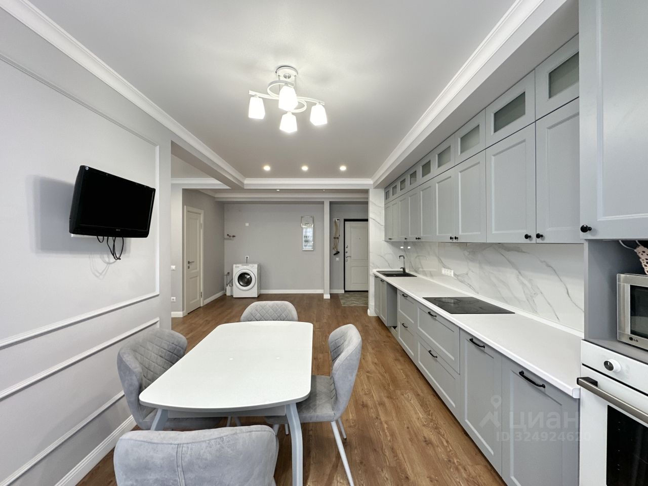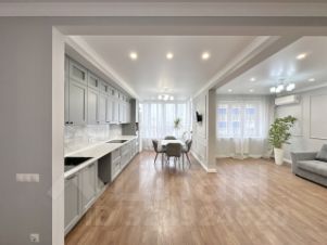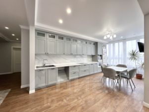 Функциональная кухня укомплектована встроенной техникой. Кухня плавно переходит в гостиную, в которой выделена обеденная зона и зона отдыха.