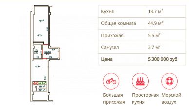 Общая площадь 45 м2 - огромная кухня, просторная прихожая.