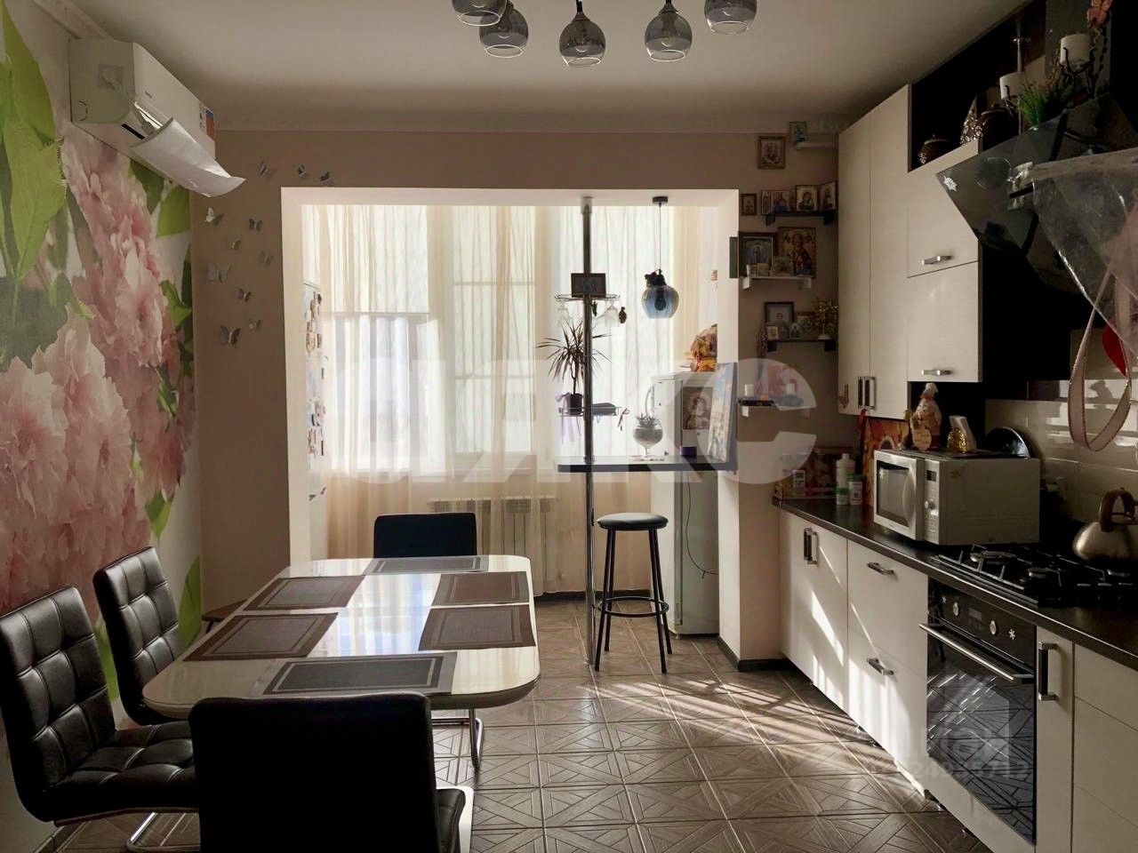 Состояние - с качественным ремонтом. Жилая комната разделена на две зоны - спальную и зону отдыха с просмотром тв. Квартира очень уютная, теплая с прекрасным видом на горный массив и прекрасные закаты.