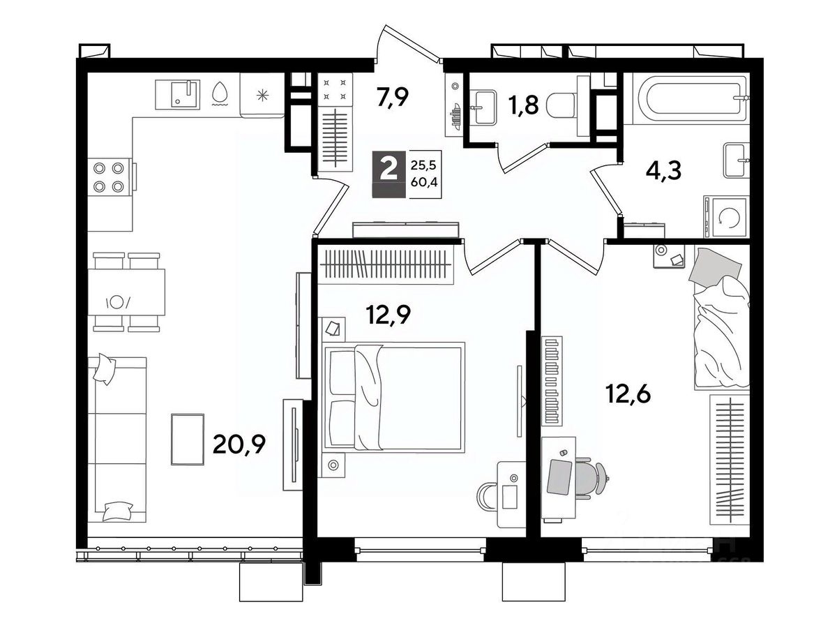 В продаже 2-комнатная квартира от застройщика! Мкр. "DOGMA PARK" г. Краснодар, Литер 32 Срок сдачи: 3 кв. 2027, общей площадью 60.4 кв.м., на 16 этаже.