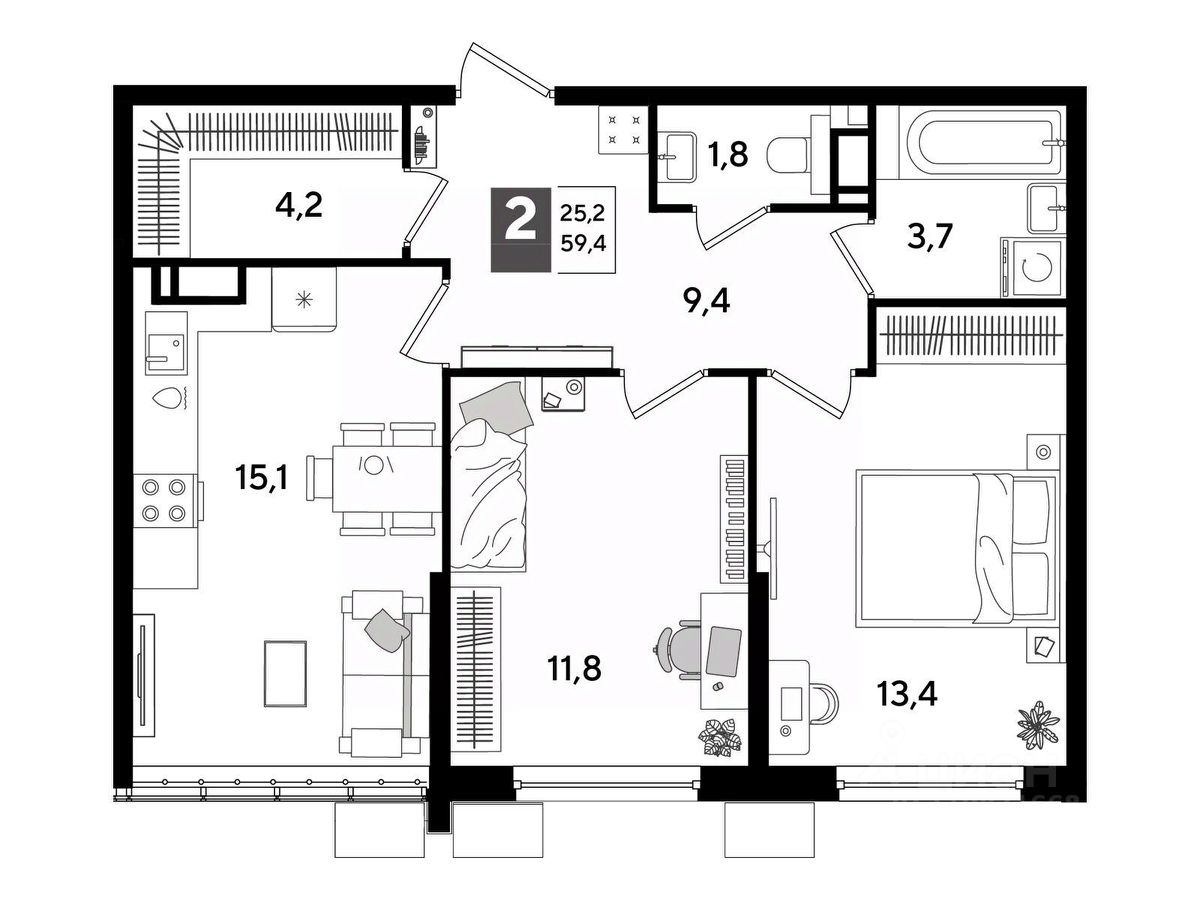 В продаже 2-комнатная квартира от застройщика! Мкр. "DOGMA PARK" г. Краснодар, Литер 32 Срок сдачи: 3 кв. 2027, общей площадью 59.4 кв.м., на 16 этаже.