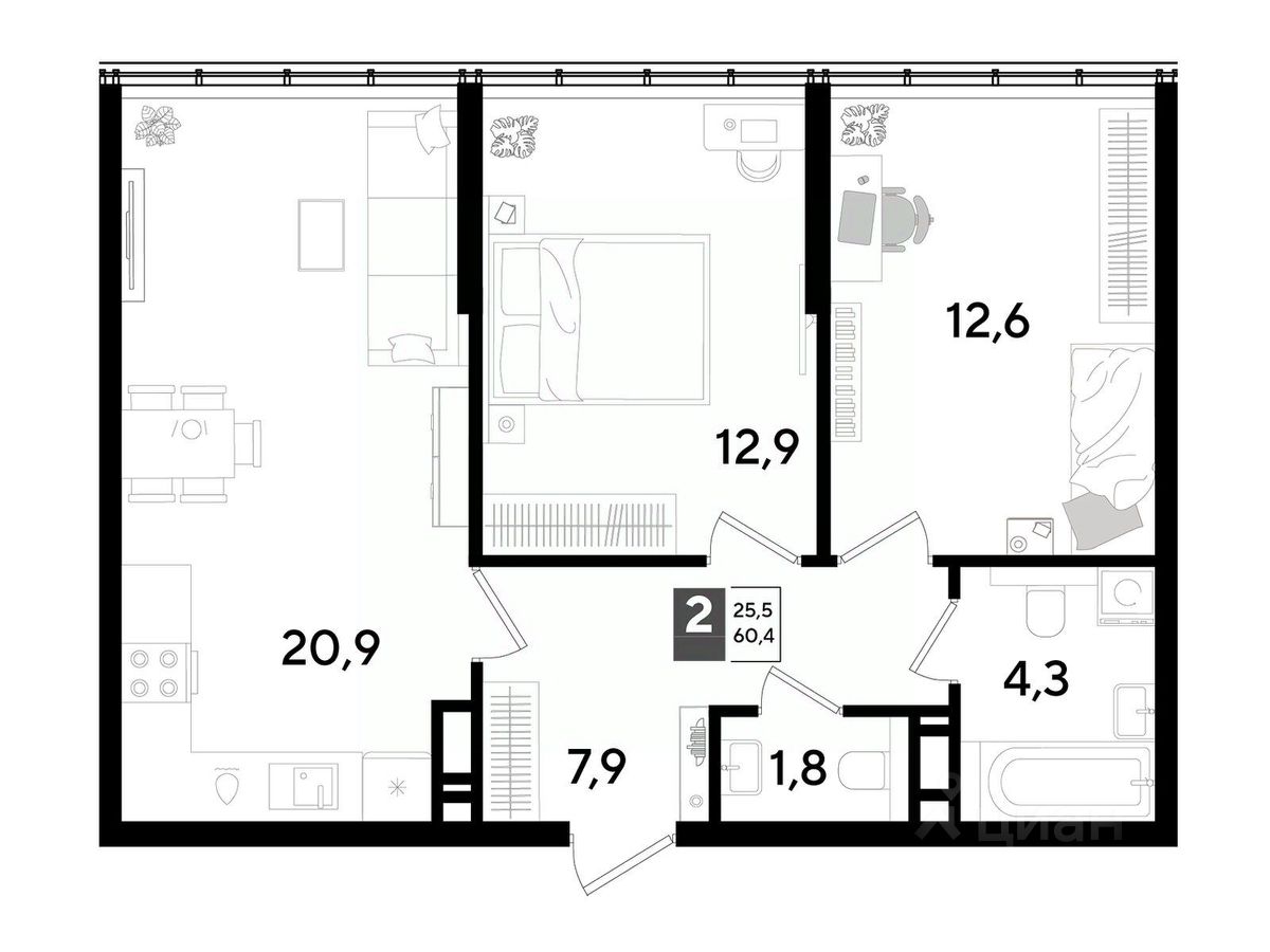 В продаже 2-комнатная квартира от застройщика! Мкр. "DOGMA PARK" г. Краснодар, Литер 30 Срок сдачи: 3 кв. 2027, общей площадью 60.4 кв.м., на 16 этаже.