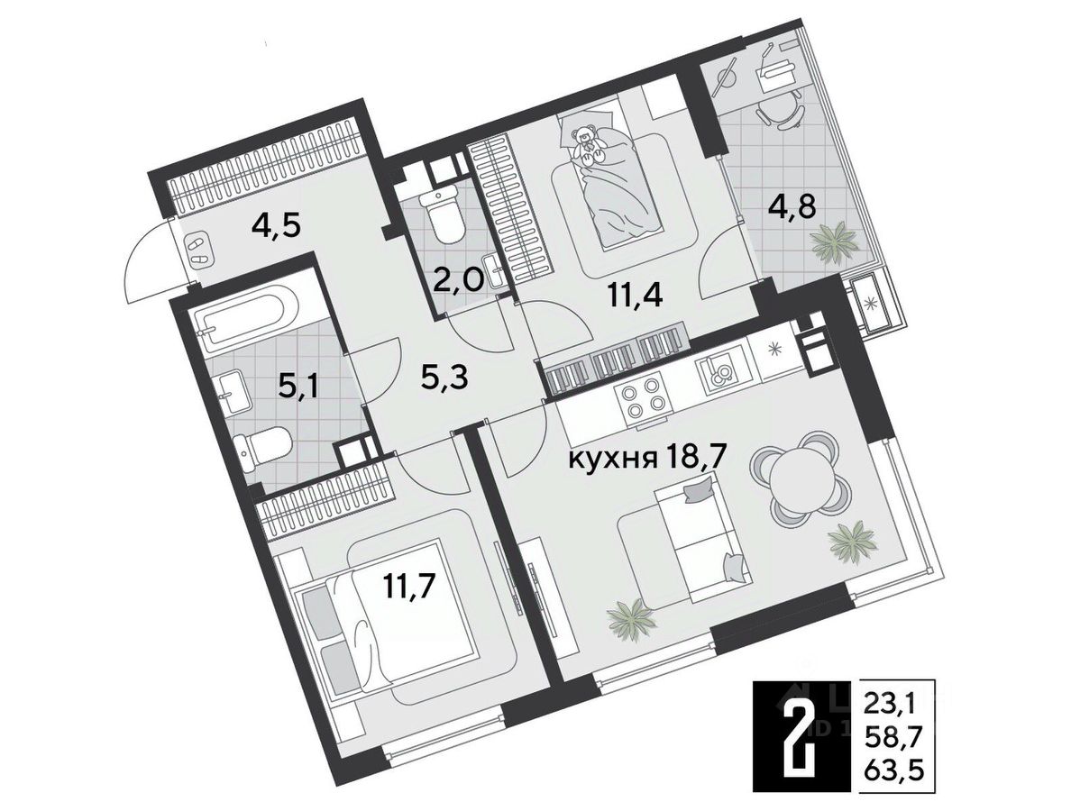 Срок сдачи: 1 кв. 2026, общей площадью 63.5 кв.м., на 15 этаже.