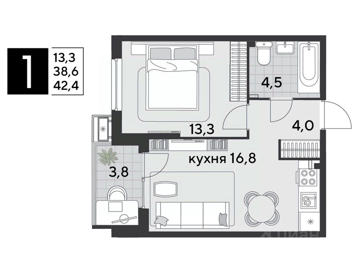 Срок сдачи: 1 кв. 2026, общей площадью 42.4 кв.м., на 2 этаже.