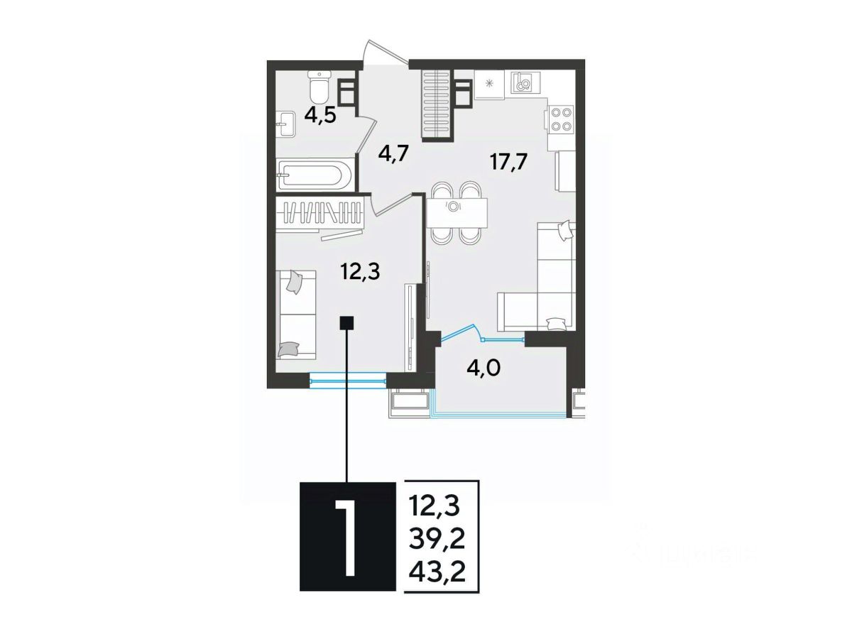 Срок сдачи: 2 кв. 2026, общей площадью 43.2 кв.м., на 3 этаже.