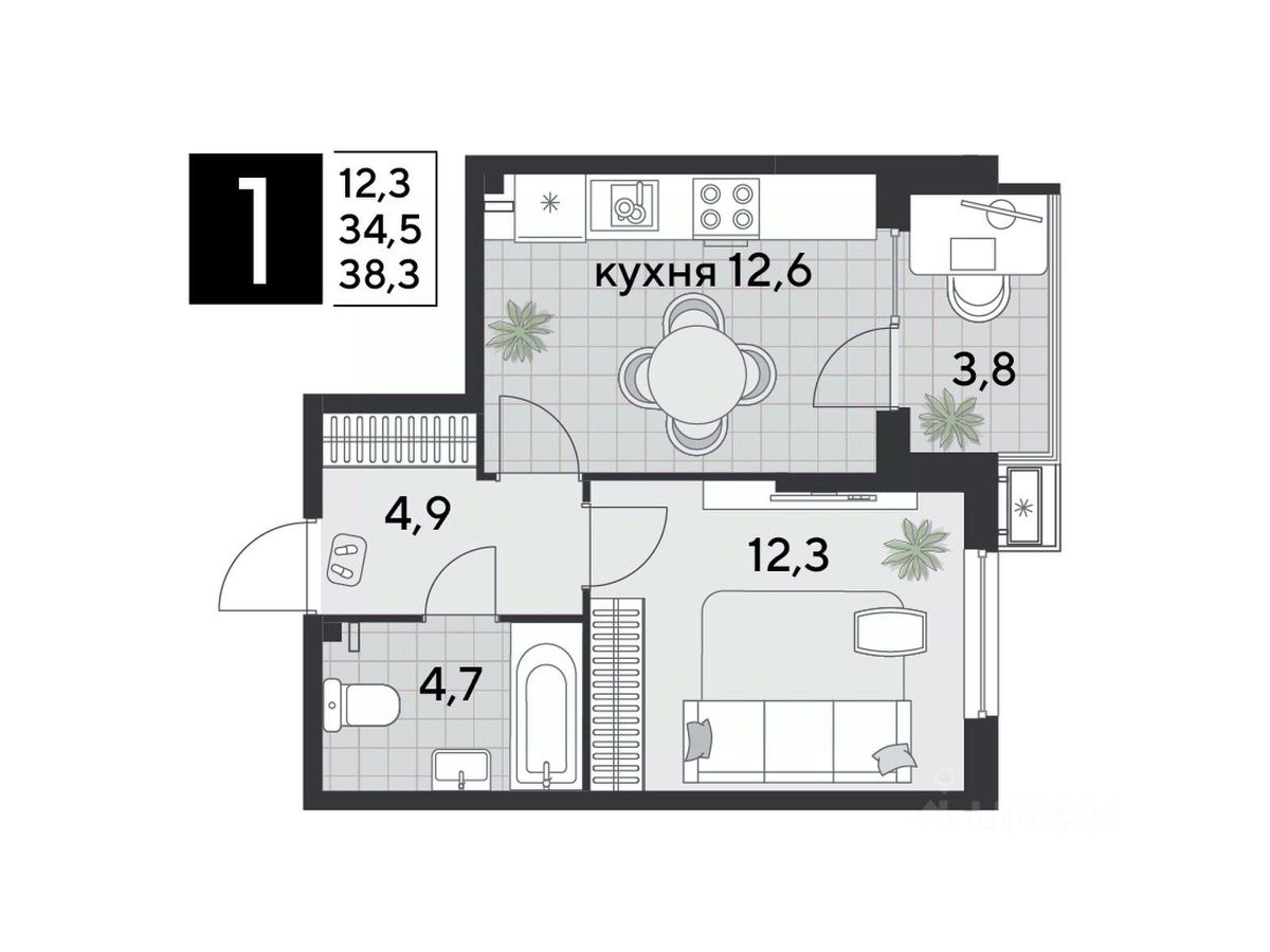 Срок сдачи: 2 кв. 2026, общей площадью 38.3 кв.м., на 2 этаже.