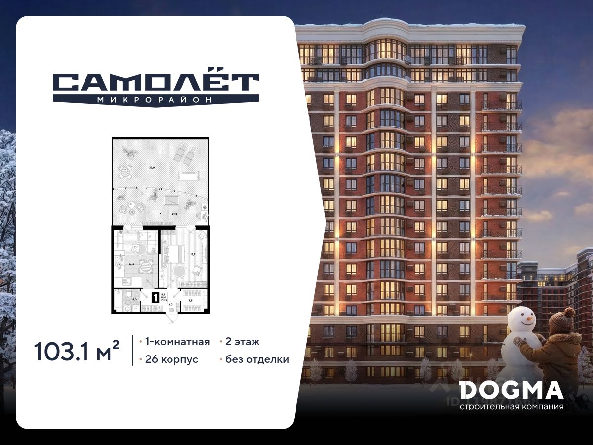 В продаже 1-комнатная квартира от застройщика! Мкр. "Самолет" 5 очередь, г. Краснодар, Литер 26 Срок сдачи: 4 кв. 2024, общей площадью 103.1 кв.м., на 2 этаже.
