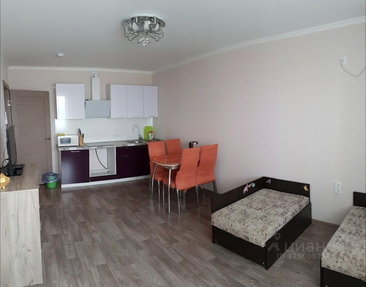 Остаётся вся мебель: кровати, шкафы, стол, стулья, комод, кухонный гарнитур; сплит в большой комнате, стиралка, телевизор, холодильник, плита, вытяжка, микроволновка, чайник, посуда.