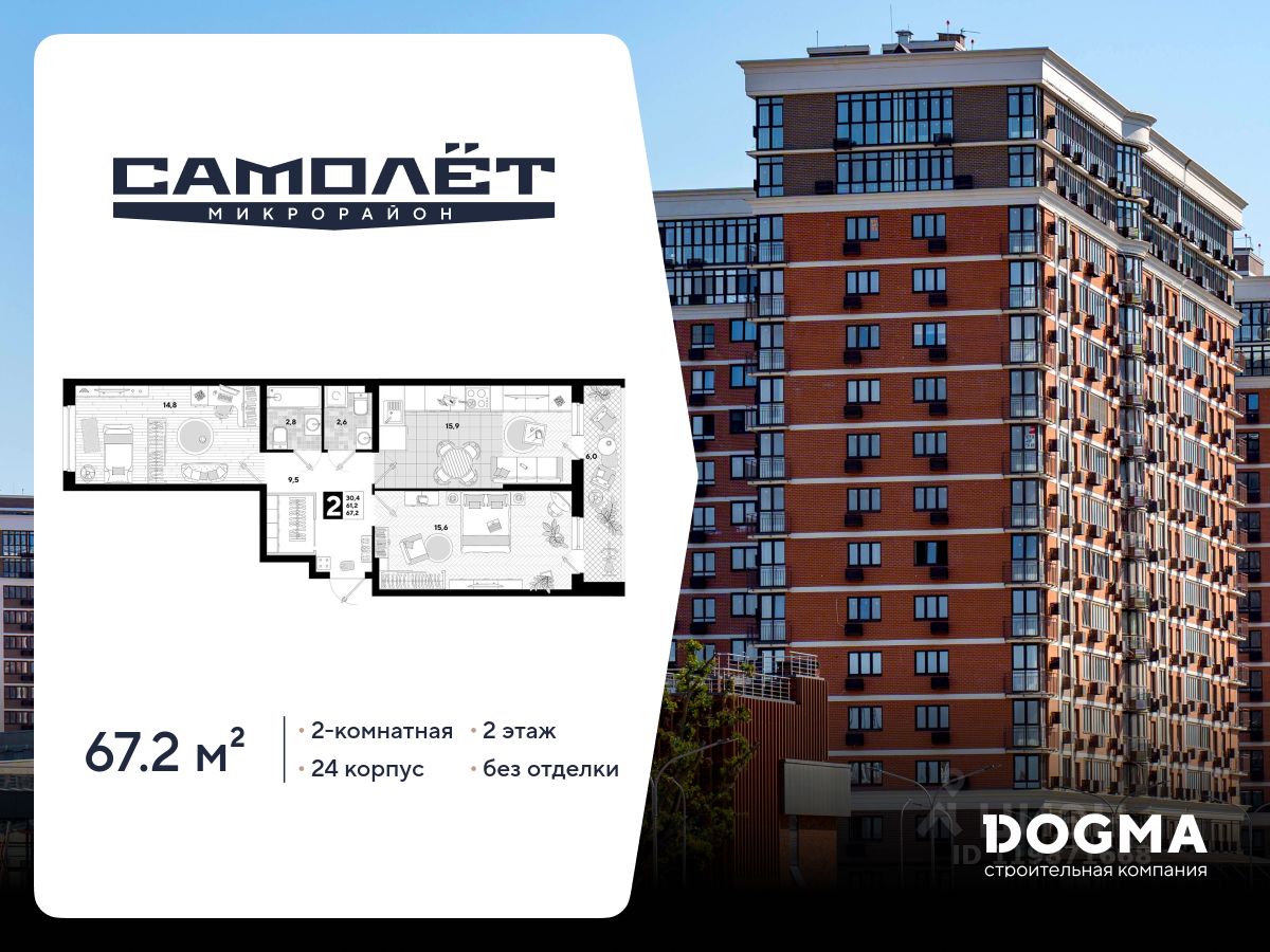 В продаже 2-комнатная квартира от застройщика! Мкр. "Самолет" 4 очередь, г. Краснодар, Литер 24 Срок сдачи: 4 кв. 2023, общей площадью 67.2 кв.м., на 2 этаже.