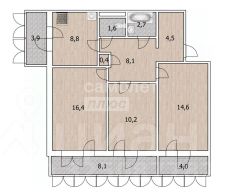 Квартира площадью 67,3 кв. м, улучшенной планировки. Комнаты раздельные - 14,6 кв. м, 10,2 кв. м, 16,4 кв. м, соответственно. Из каждой комнаты выход на лоджию. Кухня - 9 кв. м, из которой также есть выход на отдельную лоджию, благодаря чему кухня становится еще просторнее.