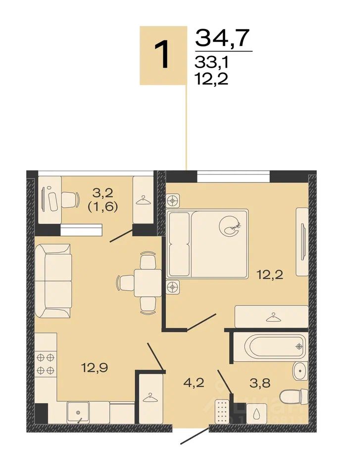 Общая площадь34,7 м²