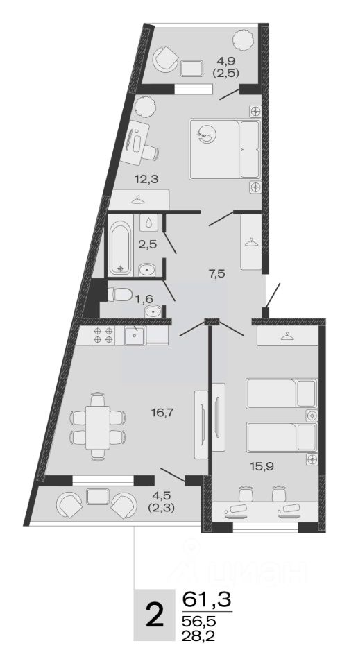 Общая площадь61,3 м²