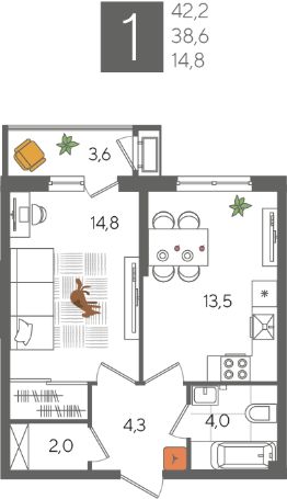 В продаже 1-комнатная квартира от застройщика! ЖК "Рекорд" 2 очередь, г. Краснодар, Литер 2 Срок сдачи: 4 кв. 2026, общей площадью 42.2 кв.м., на 2 этаже.