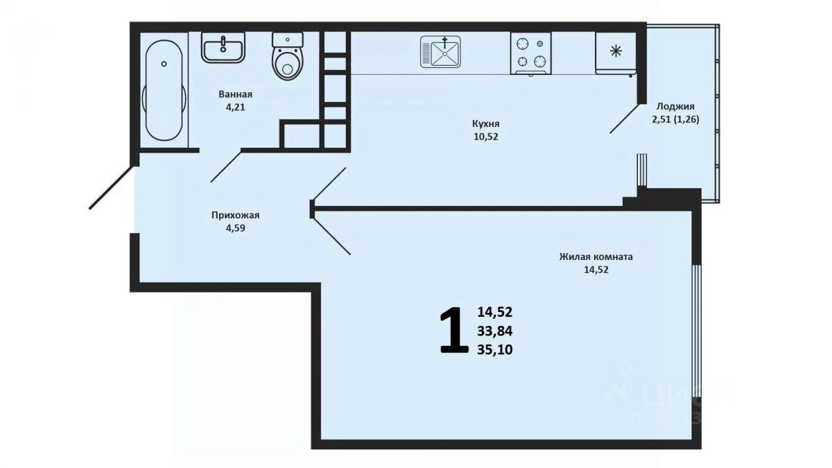Квартира на 13 этаже 16-этажного дома, площадью 33.90 кв.м. Планировка квартиры предусматривает одну комнату и кухню площадью 10.52 кв.м., что создает комфортное пространство для проживания.