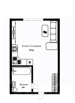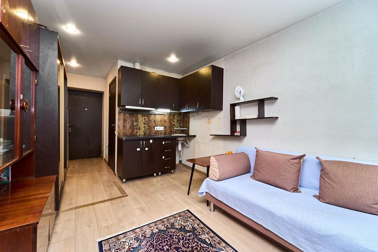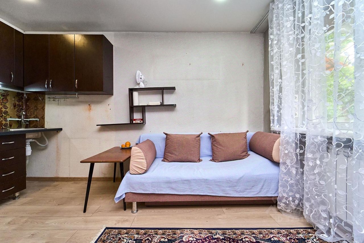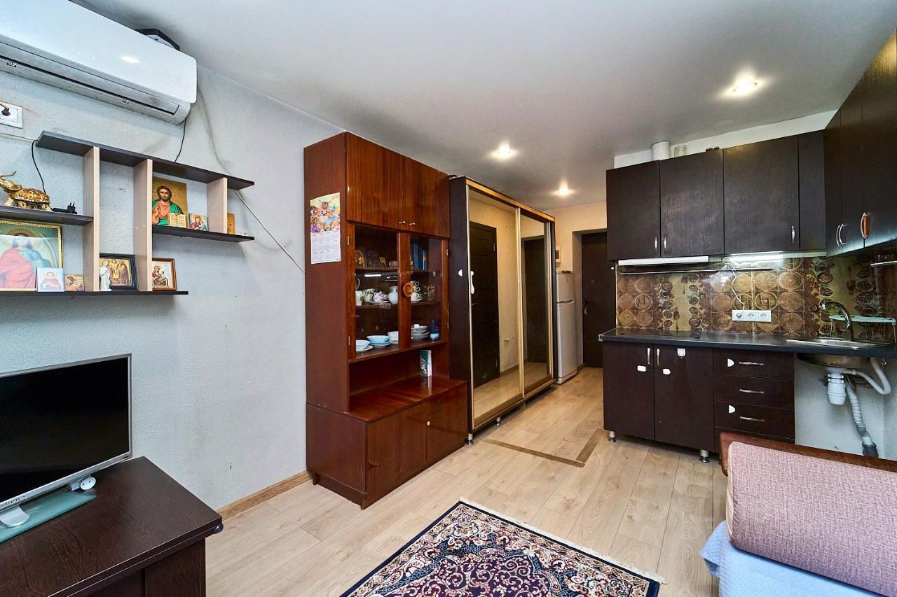 Студия с новым ремонтом, со своим сан. узлом. На полу ламинат, металлопластиковые окна, натяжной потолок. Точечные светильники. Остается мебель и техника.