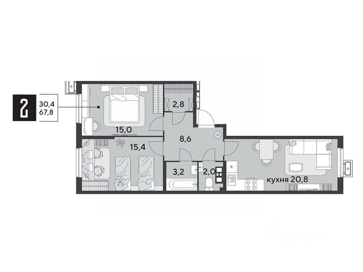 Срок сдачи: 1 кв. 2026, общей площадью 66.8 кв.м., на 3 этаже.