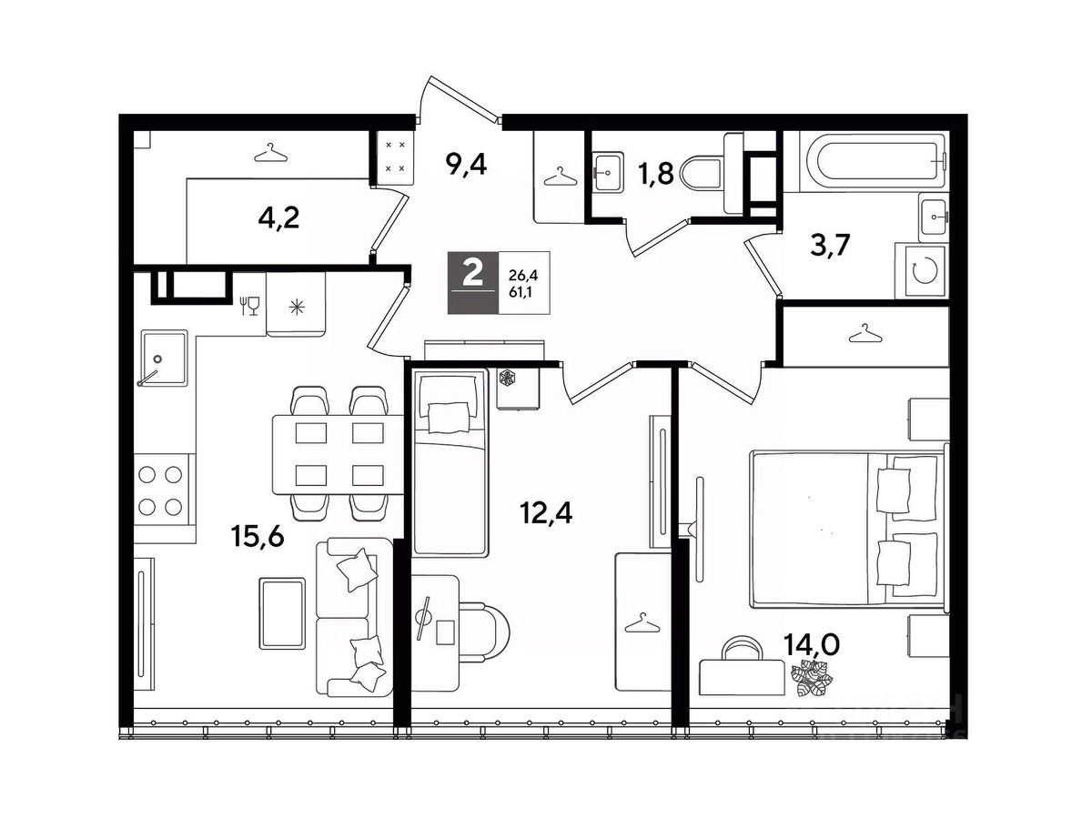 В продаже 2-комнатная квартира от застройщика! Мкр. "DOGMA PARK" г. Краснодар, Литер 21 Срок сдачи: 4 кв. 2027, общей площадью 61.1 кв.м., на 16 этаже.