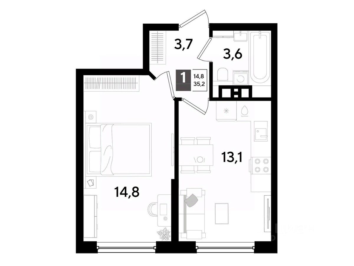 В продаже 1-комнатная квартира от застройщика! Мкр. "DOGMA PARK" г. Краснодар, Литер 22 Срок сдачи: 4 кв. 2027, общей площадью 35.2 кв.м., на 4 этаже.