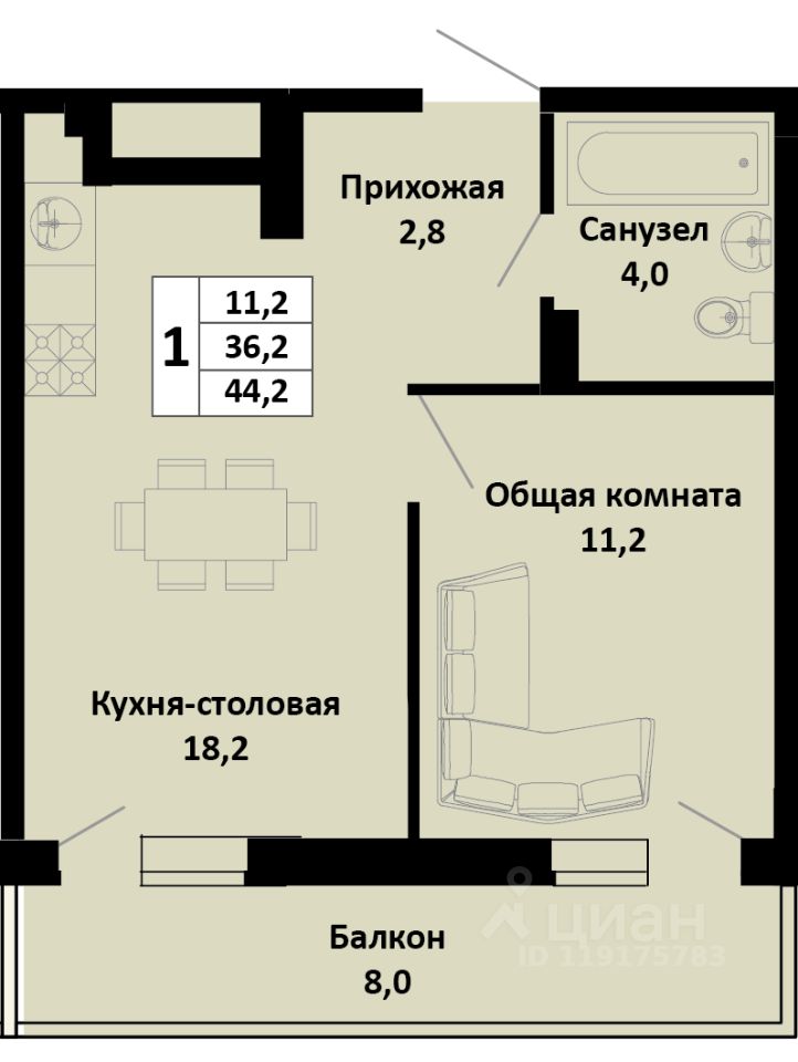 Продаётся 1-комнатная квартира в сданном доме (Литер 1), срок сдачи: IV-кв. 2025, общей площадью 43.33 кв.м., на 4 этаже. Новый жилой дом от застройщика "СЗ Кубаньновострой" расположен по адресу: Россия, Краснодарский край, Динской район, Южно-Кубанское сельское поселение, посёлок Южный, Северная улица