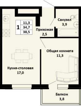 Общая площадь38,5 м²