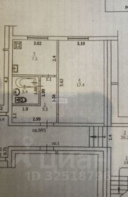 Квартира общей площадью 33,6 кв. м. (комната 17,4 кв. м., кухня 7,3 кв. м., сан. узел совмещенный 3,4 кв. м., прихожая 5,5 кв. м., окна выходят на улицу).