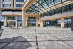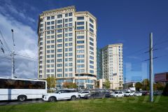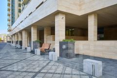 Фасад дома из травертина, выполненный по индивидуальному проекту. В подъездах установлены скоростные бесшумные лифты мирового бренда - Kone.