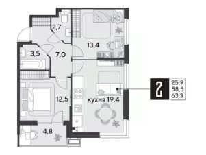 Срок сдачи: 1 кв. 2026, общей площадью 62.9 кв.м., на 2 этаже.