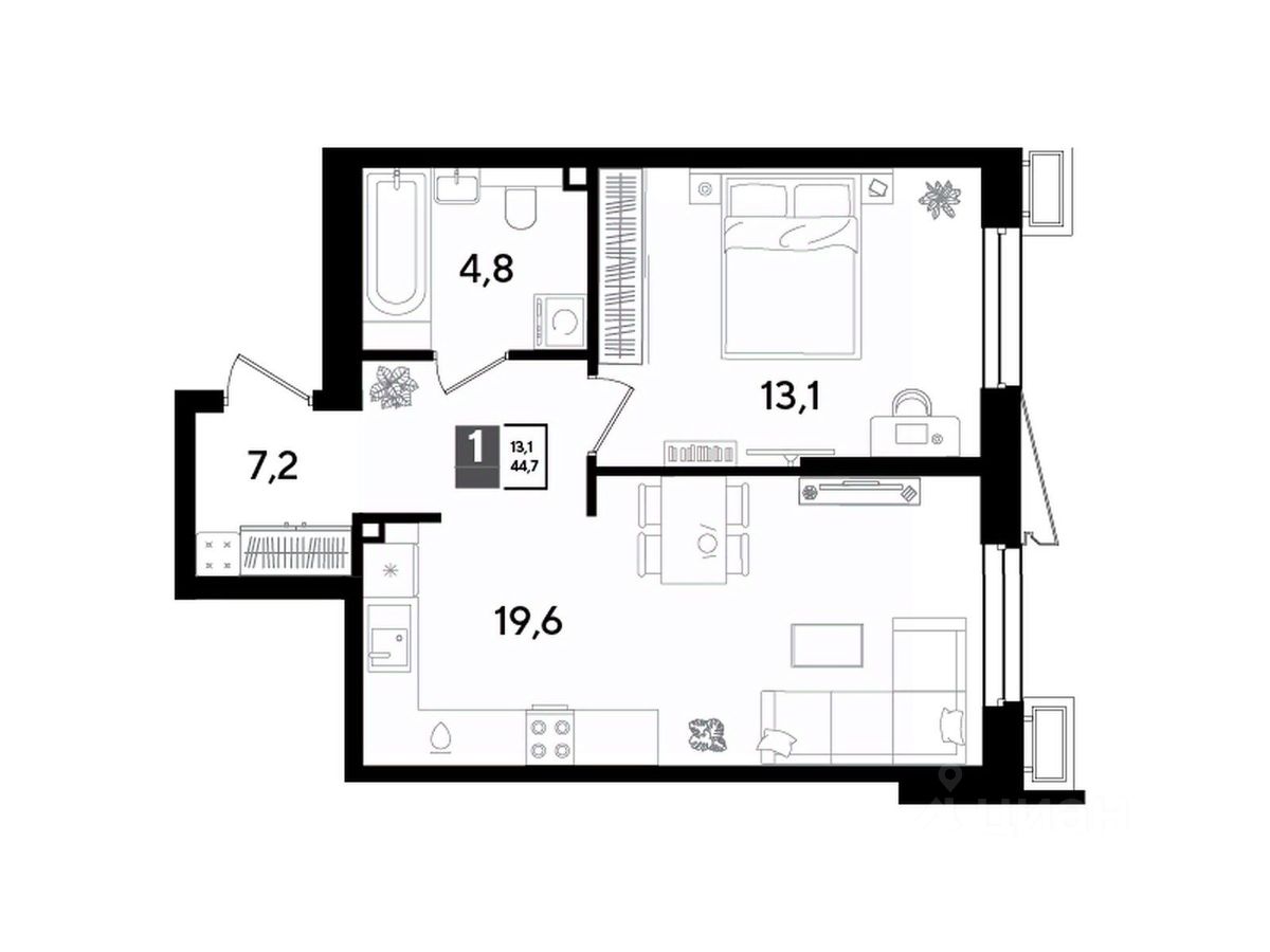 Срок сдачи: 1 кв. 2026, общей площадью 44.7 кв.м., на 2 этаже.