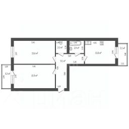 Площадь по документам 57,4 кв м, но с учётом балконов 63,7 кв м.