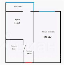 Общая площадь квартиры 38,6 кв. м + застекленный балкон 4 м2. Жилая площадь 18 кв. м. Площадь кухни 11 кв. м.