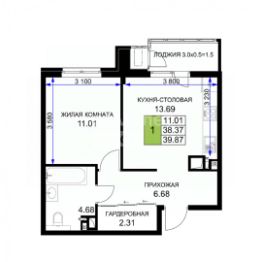 Площадь объекта 38.4м2. Высота потолков 2,8м. Кухня 13,7м2. Комната 11м2.