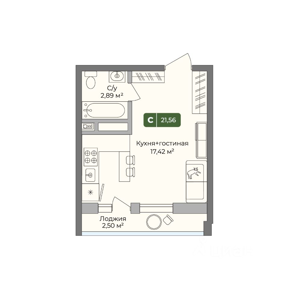 Уникальная студия 1 площадью 21,56кв.м.(Л1 подъезд 1) в ЖК "Цитрус".