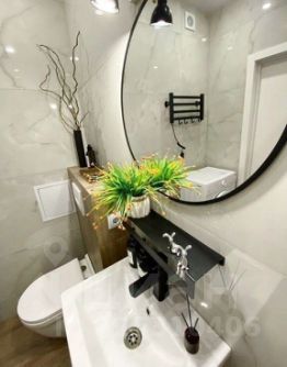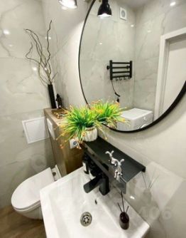 Совмещенный санузел отделан качественным керамогранитом и оборудован инсталляцией, ванной, полотенцесушителем и фирменной сантехникой. Это идеальное место для отдыха после насыщенного дня!