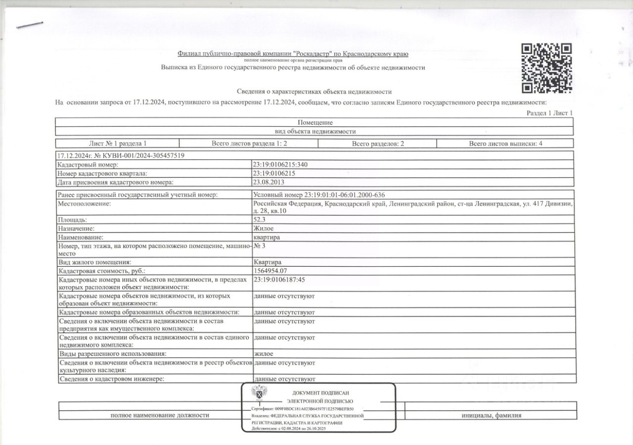 Д-к: Посух Е.Ю. Квартира, площадь 52,3 кв.м., кадастровый номер 23:19:0106215:340. Адрес: Краснодарский край, Ленинградский район, ст. Ленинградская, ул. им. 417 Дивизии, д. 28, кв. 10. Начальная цена 3 240 000 руб., задаток 3 240 руб., шаг аукциона 32 400 руб., ув. 1703