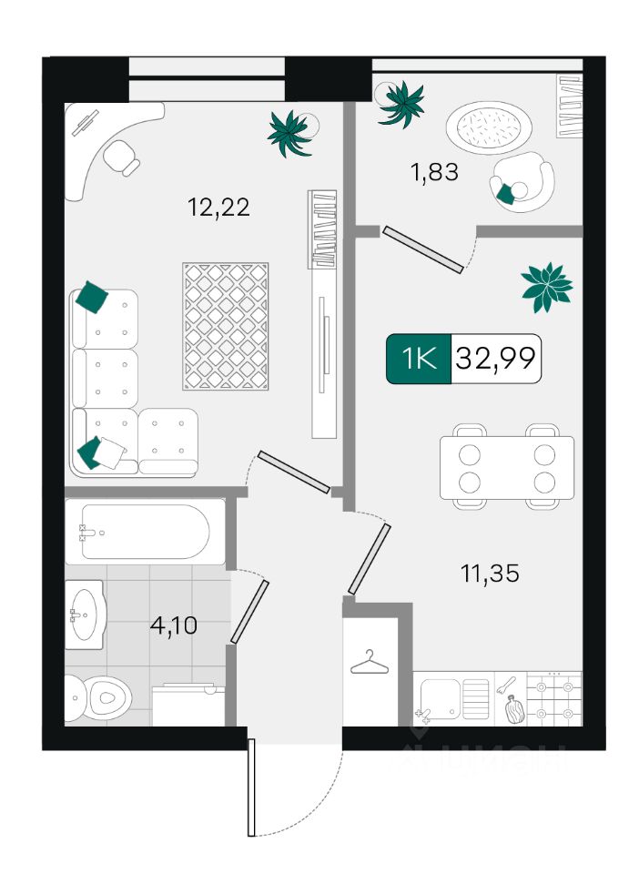Общая площадь32,99 м²