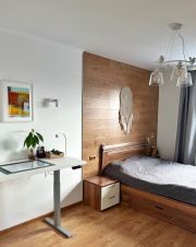 Светлая просторная комната с элементом зонирования. Большая двуспальная кровать с ортопедическим матрасом, прикроватные тумбочки, комод, гостиный модуль с полками, система стеллажей, откидной письменный столик.