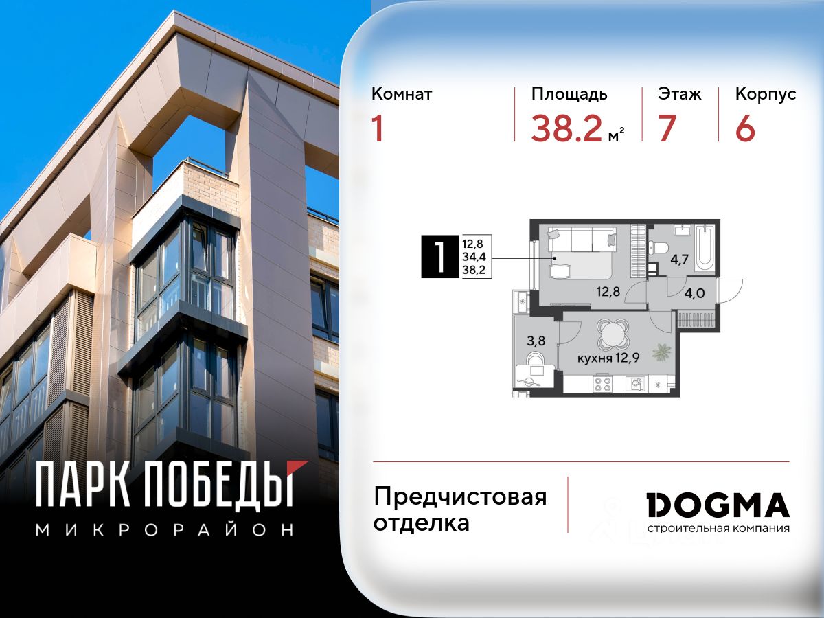 Срок сдачи: 2 кв. 2026, общей площадью 38.2 кв.м., на 7 этаже.