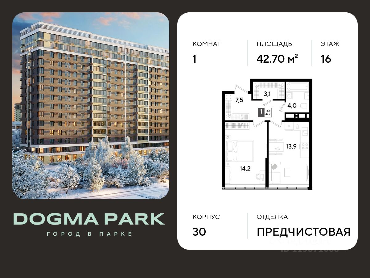 В продаже 1-комнатная квартира от застройщика! Мкр. "DOGMA PARK" г. Краснодар, Литер 30 Срок сдачи: 3 кв. 2027, общей площадью 42.7 кв.м., на 16 этаже.