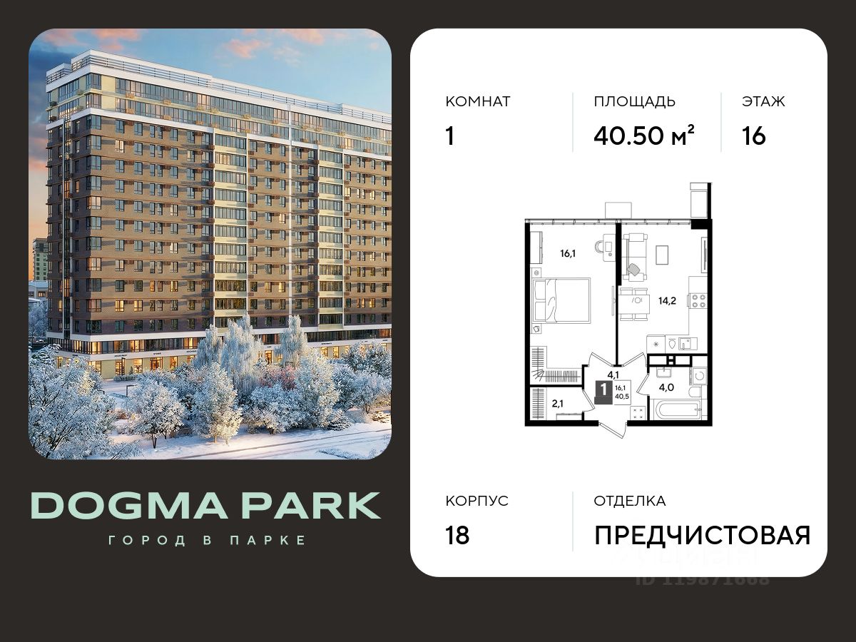 В продаже 1-комнатная квартира от застройщика! Мкр. "DOGMA PARK" г. Краснодар, Литер 18 Срок сдачи: 4 кв. 2027, общей площадью 40.5 кв.м., на 16 этаже.