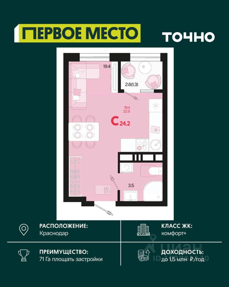 Жилой район "Первое место"- один из самых масштабных проектов в России. На территории 71 га 18 кварталов, 31 дом переменной этажности от 8 до 18 этажей, собственный парк 9 га, храмовый комплекс, пешеходный бульвар "Круг семьи", детские и спортивные площадки, мангальные зоны и различные локации для отдыха. В шаговой доступности действующие муниципальные образовательные учреждения: школа на 1 100 мест и детский сад на 250 мест. Помимо этого, в жилом районе "Первое место" построятся школа на 1700 мест с крытым 25-метровым бассейном и 5 детских садов на 1 490 мест. На первых этажах многоуровневых парковок "паркхабов" разместится более 61 тыс м2 коммерческих помещений. Жителям будут доступны собственный фитнес-центр, кафе, рестораны и магазины. В каждом подъезде предусмотрены дизайнерские холлы в стиле лобби отелей, консьерж-сервис, лапомойки, отдельные колясочные и велосипедные. Также в домах будут просторные кладовые помещения и комнаты для хранения почты с почтоматами для получения посылок из маркетплейсов.