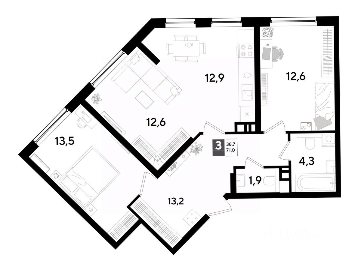 В продаже 3-комнатная квартира от застройщика! Мкр. "DOGMA PARK" г. Краснодар, Литер 30 Срок сдачи: 3 кв. 2027, общей площадью 71 кв.м., на 5 этаже.
