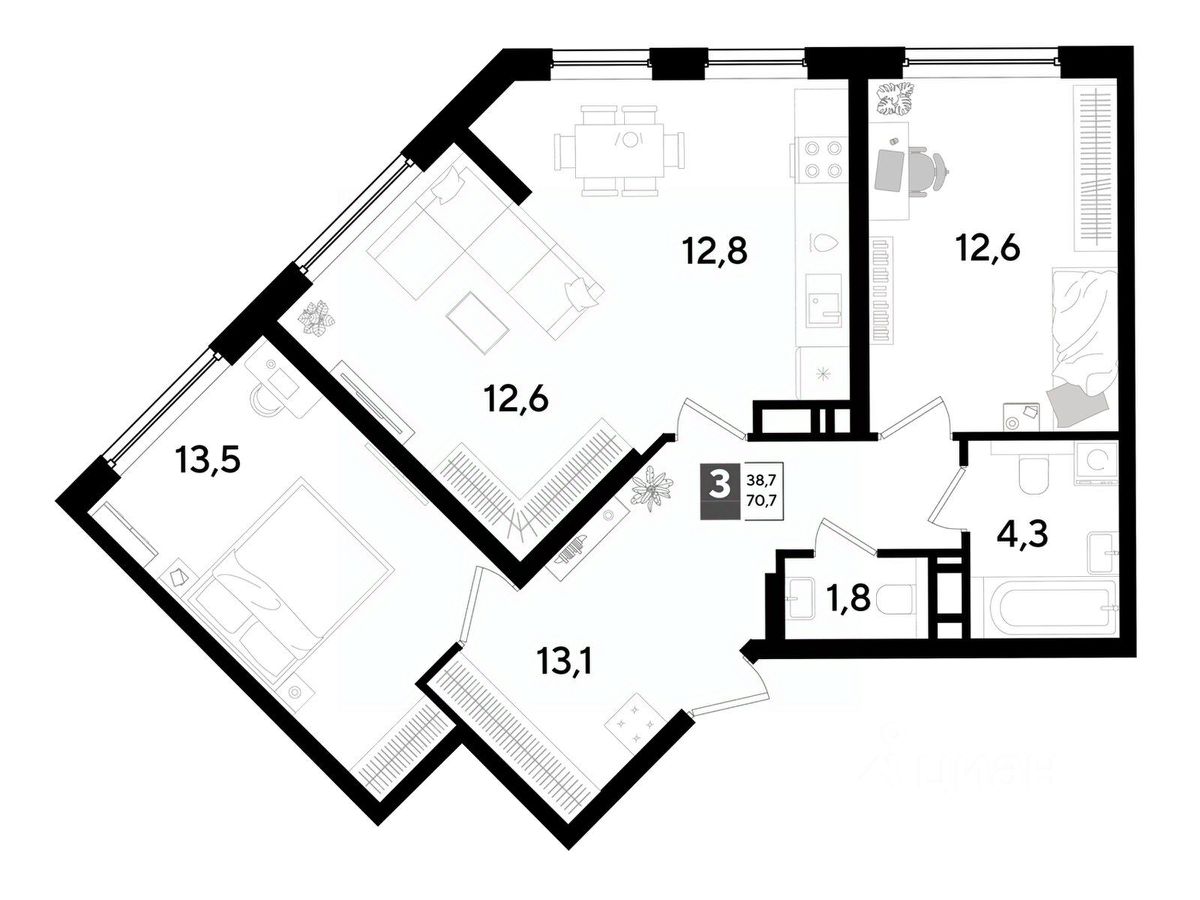 В продаже 3-комнатная квартира от застройщика! Мкр. "DOGMA PARK" г. Краснодар, Литер 30 Срок сдачи: 3 кв. 2027, общей площадью 70.7 кв.м., на 12 этаже.