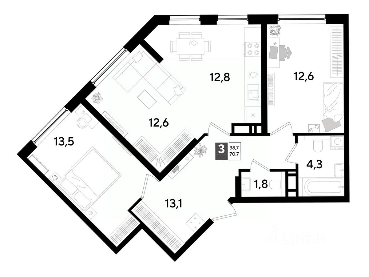 В продаже 3-комнатная квартира от застройщика! Мкр. "DOGMA PARK" г. Краснодар, Литер 30 Срок сдачи: 3 кв. 2027, общей площадью 70.7 кв.м., на 14 этаже.