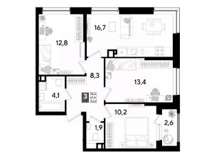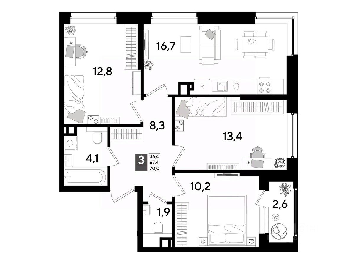 В продаже 3-комнатная квартира от застройщика! Мкр. "DOGMA PARK" г. Краснодар, Литер 33 Срок сдачи: 3 кв. 2027, общей площадью 70 кв.м., на 3 этаже.