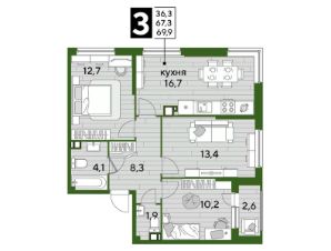 В продаже 3-комнатная квартира от застройщика! Мкр. "DOGMA PARK" г. Краснодар, Литер 36 Срок сдачи: 4 кв. 2027, общей площадью 69.9 кв.м., на 9 этаже.